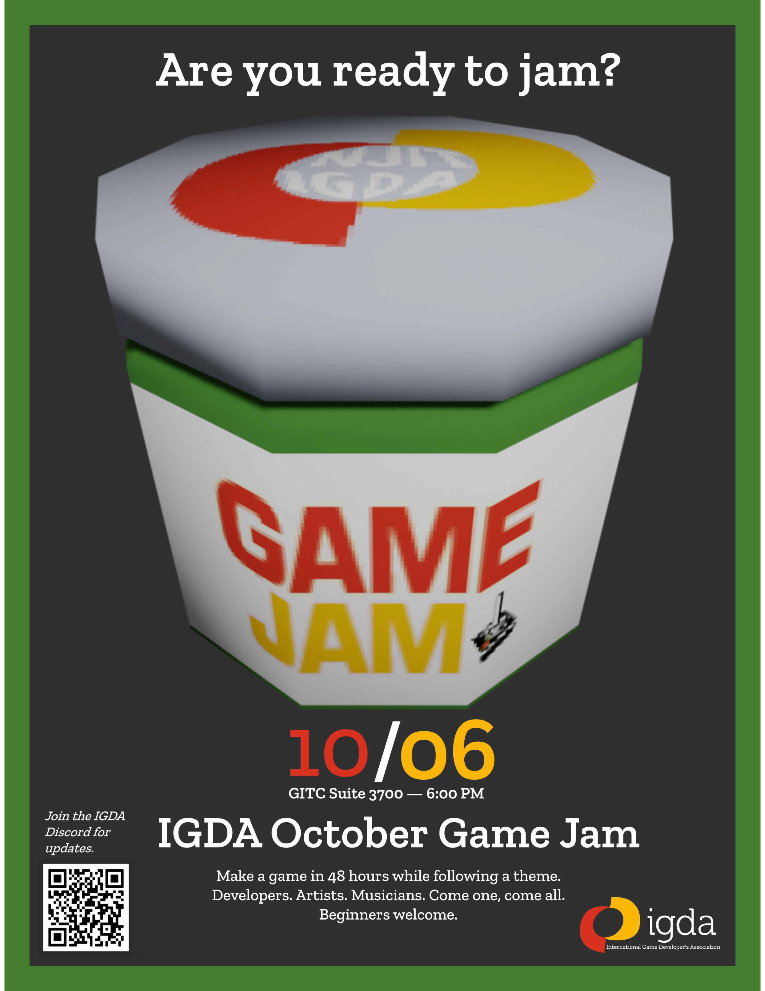 The Game Developer's Association's monthly game jam, commonly found in the Guttenburg Information Technology Center as well as scattered around campus. Note the very large container of game jam in the center.