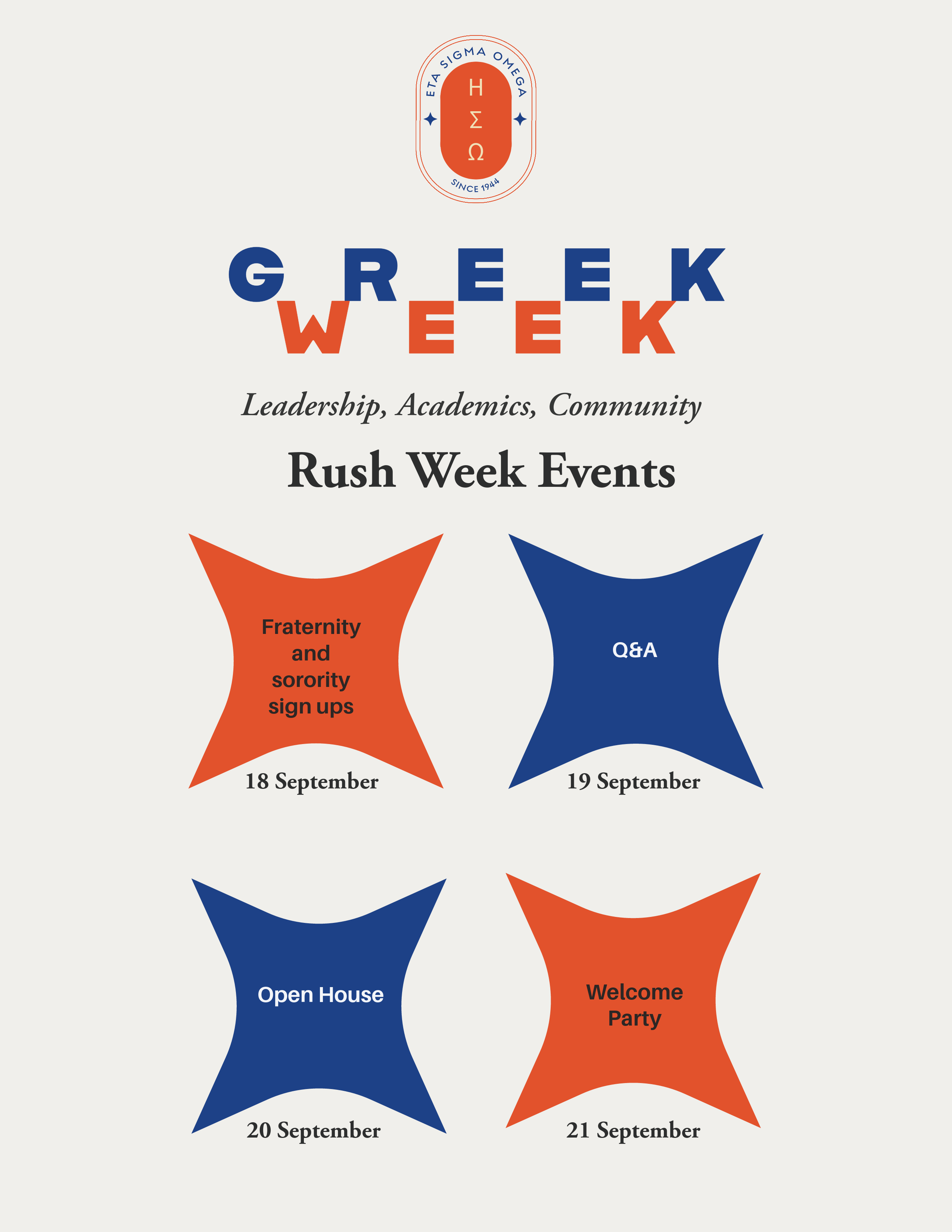 At the beginning of the semester, fraternities and sororities post rush calendars, with a list of events that span over a month or more. Although most rush calendars take the form of a literal calendar, this one is a little more generic looking, maybe to make it stand out less?