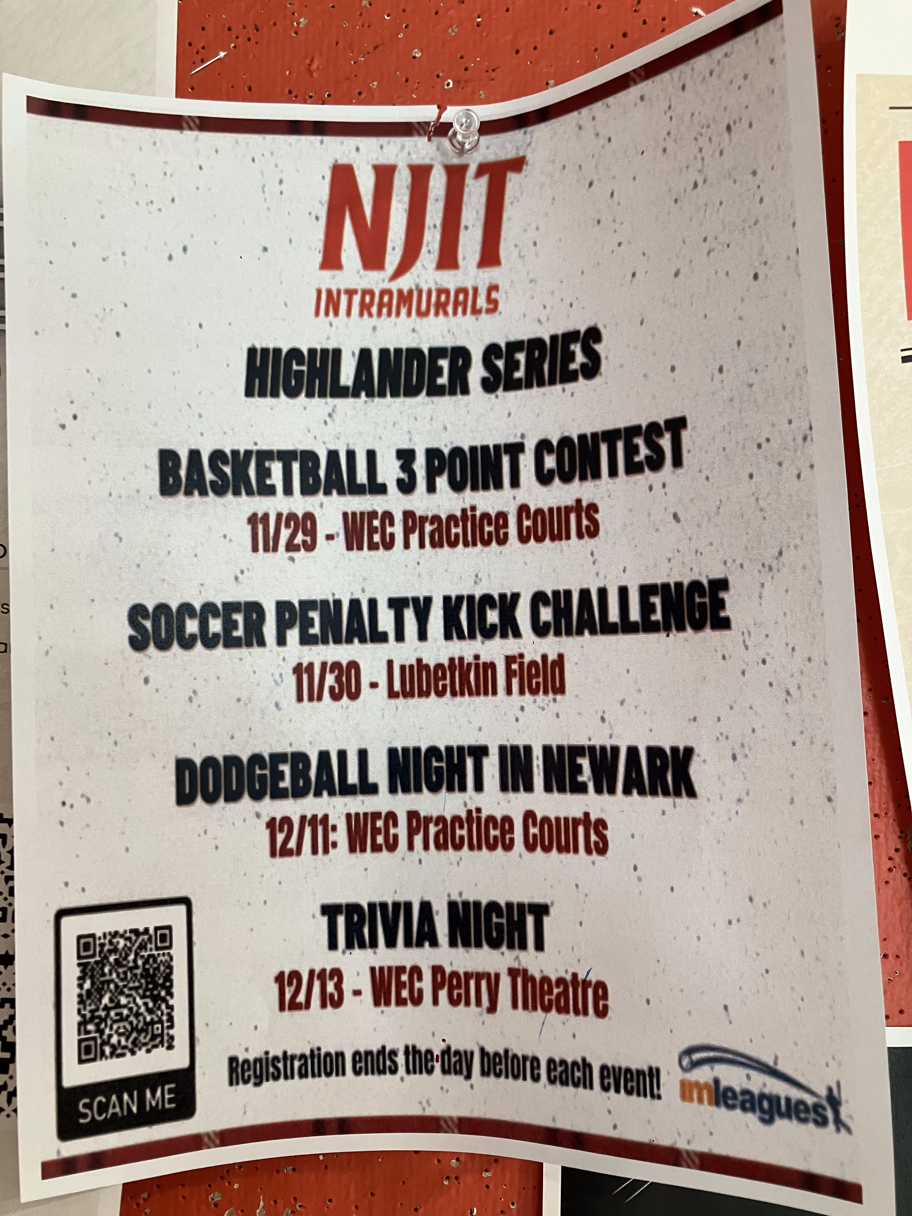 A basic schedule for intramural sports, usually posted in Campus Center and the Wellness and Events Center, and rarely found in the academic buildings.